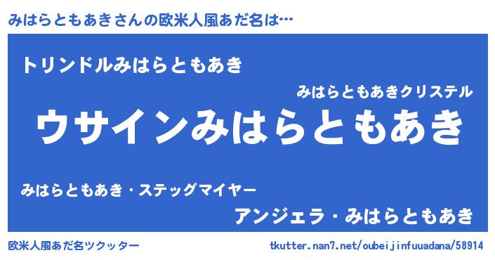 | 女子向けラノベタイトル風あだ名 | 『みはらともあきの卵を拾いまして』 |