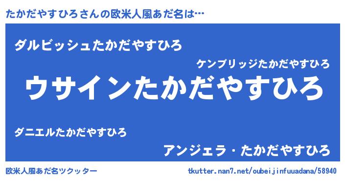 | 男性向けラノベタイトル風あだ名 | 『たかだやすひろの嫁は女の子じゃないと思った?』 |