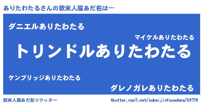 | 男性向けラノベタイトル風あだ名 | 『ありたわたる~年齢イコール彼女いない歴の魔法使い~』 |