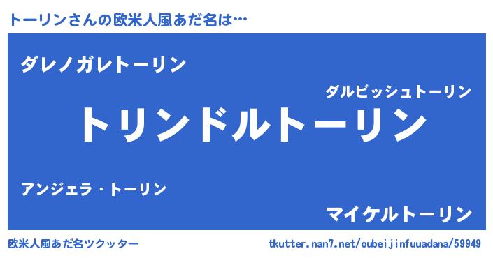| 男性向けラノベタイトル風あだ名 | 『トーリン~年齢イコール彼女いない歴の魔法使い~』 |