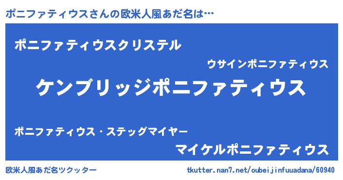 | 男性向けラノベタイトル風あだ名 | 『Re:ポニファティウスから始める異世界生活』 |