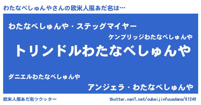 | 男性向けラノベタイトル風あだ名 | 『わたなべしゅんや~年齢イコール彼女いない歴の魔法使い~』 |