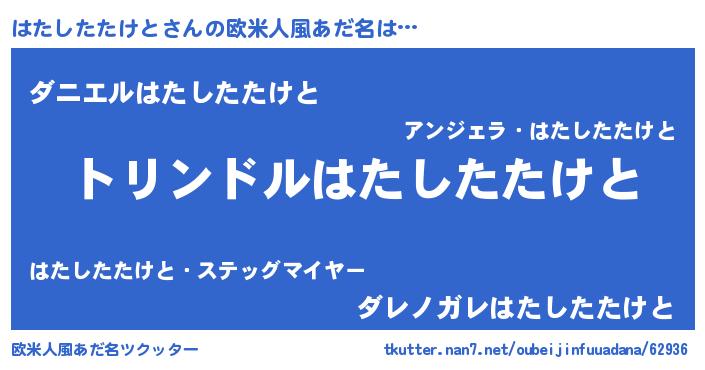 | 男性向けラノベタイトル風あだ名 | 『転生したらはたしたたけとだった件』 |
