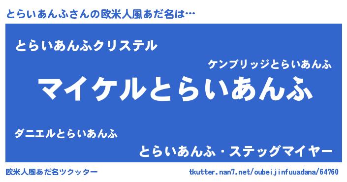 | 男性向けラノベタイトル風あだ名 | 『とらいあんふの憂鬱』 |