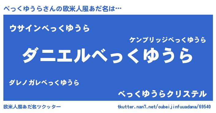 | 男性向けラノベタイトル風あだ名 | 『おまえをオタクにしてやるから、俺をべっくゆうらにしてくれ! 』 |