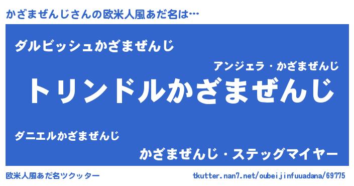 | 男性向けラノベタイトル風あだ名 | 『かざまぜんじ~年齢イコール彼女いない歴の魔法使い~』 |