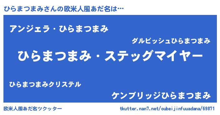 | 男性向けラノベタイトル風あだ名 | 『うちのひらまつまみが世界を掌握している!』 |