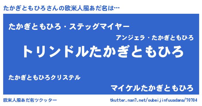 | 男性向けラノベタイトル風あだ名 | 『転生したらたかぎともひろだった件』 |
