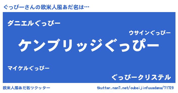 | 男性向けラノベタイトル風あだ名 | 『Re:ぐっぴーから始める異世界生活』 |