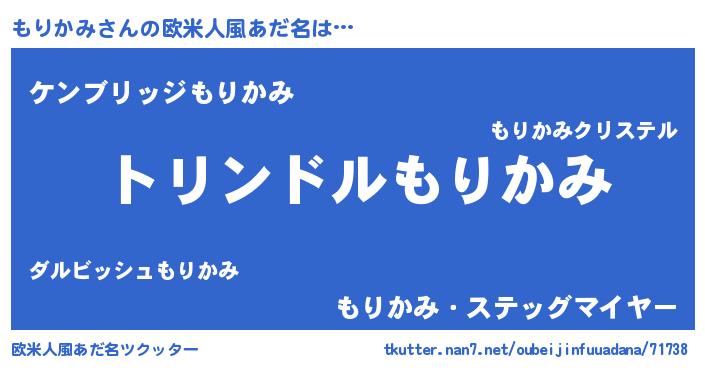 | 男性向けラノベタイトル風あだ名 | 『もりかみ~年齢イコール彼女いない歴の魔法使い~』 |