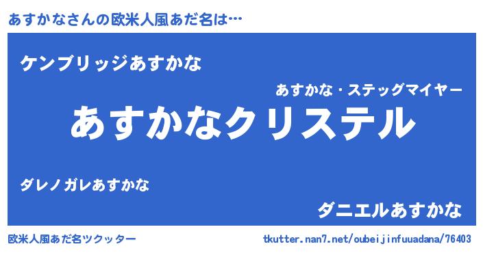 | 男性向けラノベタイトル風あだ名 | 『うちの娘の為ならば、俺はもしかしたらあすかなも倒せるかもしれない。』 |