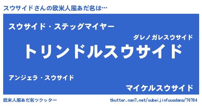 | 男性向けラノベタイトル風あだ名 | 『スウサイド~年齢イコール彼女いない歴の魔法使い~』 |
