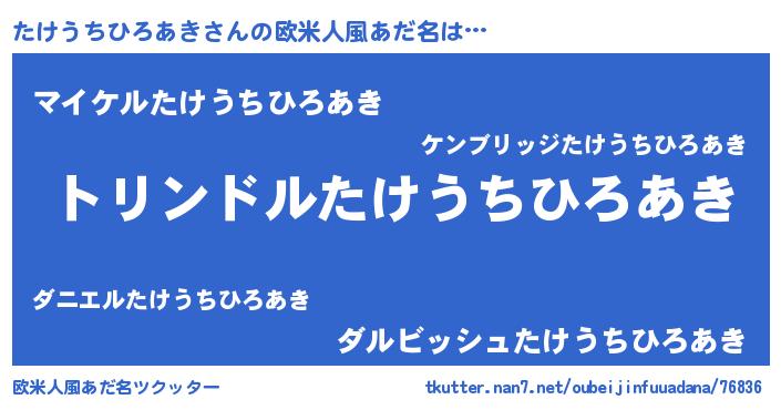 | 男性向けラノベタイトル風あだ名 | 『たけうちひろあき~年齢イコール彼女いない歴の魔法使い~』 |