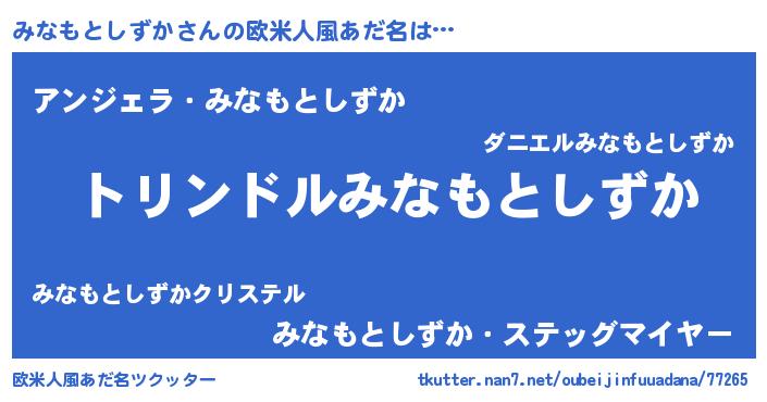 | 男性向けラノベタイトル風あだ名 | 『みなもとしずか~年齢イコール彼女いない歴の魔法使い~』 |