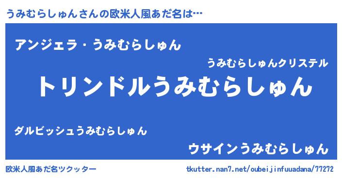 | 男性向けラノベタイトル風あだ名 | 『うみむらしゅん~年齢イコール彼女いない歴の魔法使い~』 |