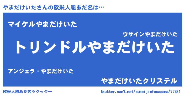 | 男性向けラノベタイトル風あだ名 | 『やまだけいた~年齢イコール彼女いない歴の魔法使い~』 |