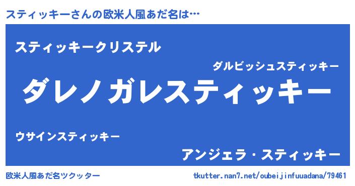 | 男性向けラノベタイトル風あだ名 | 『この素晴らしい世界にスティッキーを!』 |