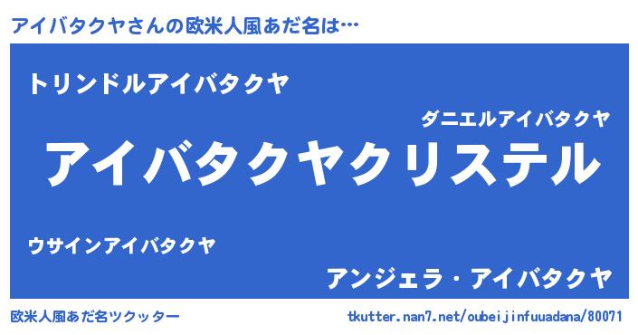 | 女子向けラノベタイトル風あだ名 | 『アイバタクヤの雑貨屋さん』 |