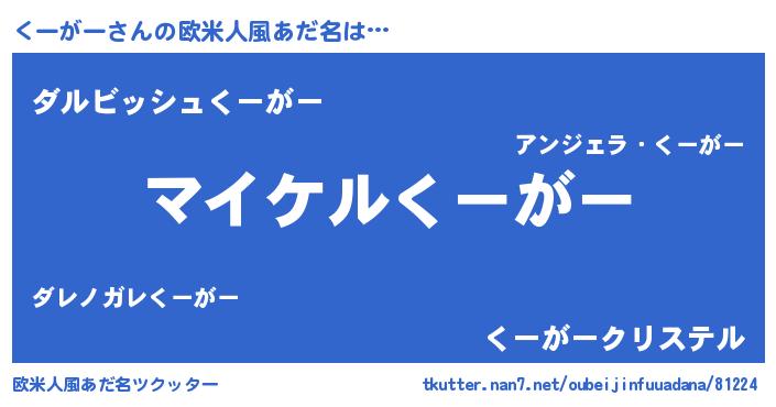 | 男性向けラノベタイトル風あだ名 | 『くーがーの憂鬱』『魔弾の王とくーがー』 |