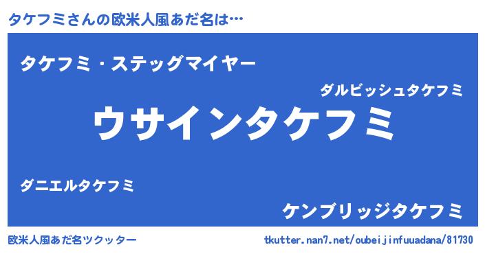 | 男性向けラノベタイトル風あだ名 | 『タケフミの嫁は女の子じゃないと思った?』 |