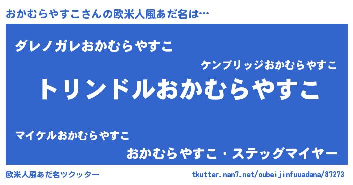 | 男性向けラノベタイトル風あだ名 | 『おかむらやすこ~年齢イコール彼女いない歴の魔法使い~』 |