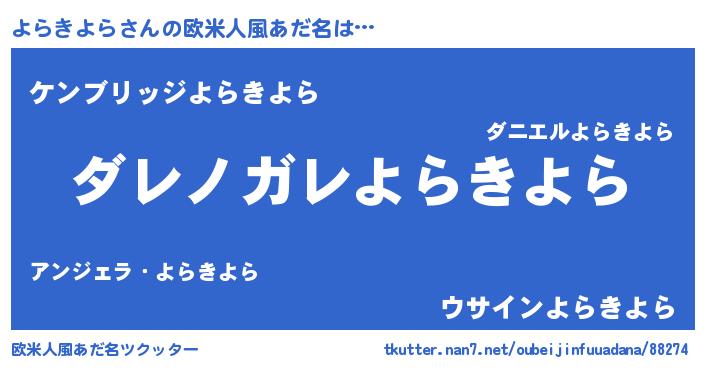| 男性向けラノベタイトル風あだ名 | 『この素晴らしい世界によらきよらを!』 |