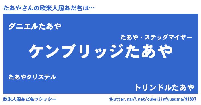 | 男性向けラノベタイトル風あだ名 | 『Re:たあやから始める異世界生活』 |