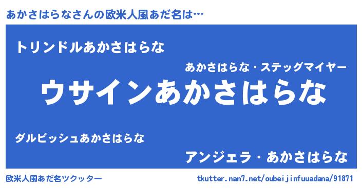 | 男性向けラノベタイトル風あだ名 | 『あかさはらなの嫁は女の子じゃないと思った?』 |