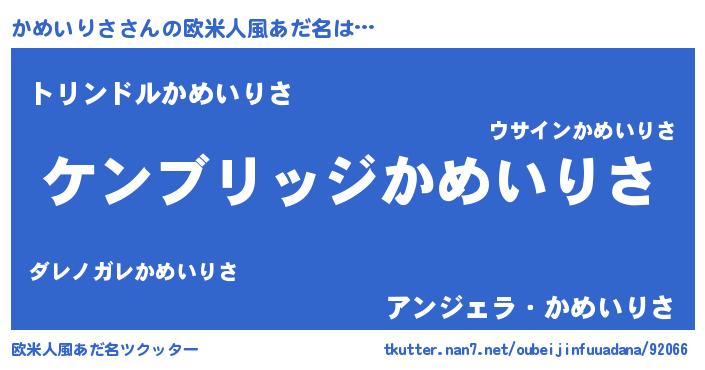 | 男性向けラノベタイトル風あだ名 | 『Re:かめいりさから始める異世界生活』 |