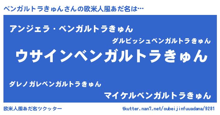 | 男性向けラノベタイトル風あだ名 | 『ベンガルトラきゅんの嫁は女の子じゃないと思った?』 |