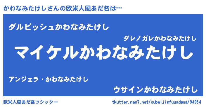 | 男性向けラノベタイトル風あだ名 | 『カワナミタケシアートオンライン』 |