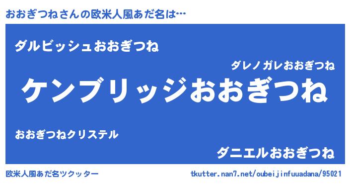 | 男性向けラノベタイトル風あだ名 | 『Re:おおぎつねから始める異世界生活』 |