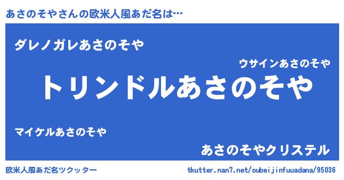 | 男性向けラノベタイトル風あだ名 | 『あさのそや~年齢イコール彼女いない歴の魔法使い~』 |