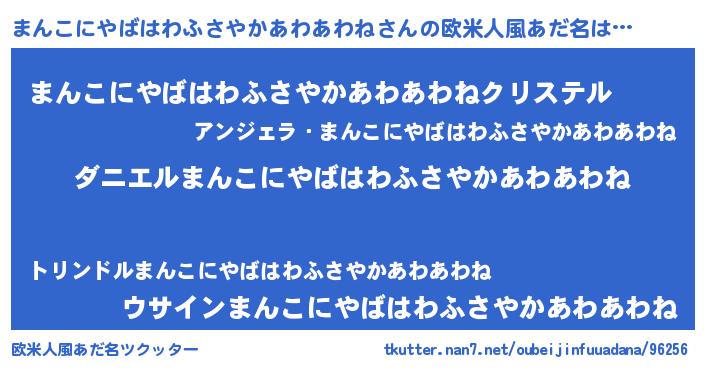 | 女子向けラノベタイトル風あだ名 | 『まんこにやばはわふさやかあわあわね夫妻のなれそめ』 |