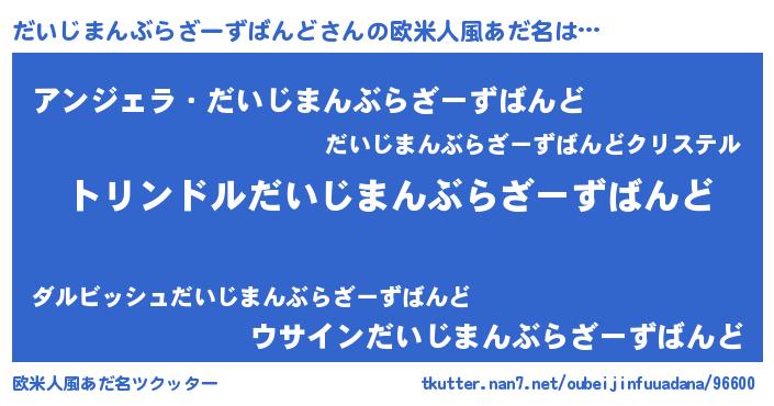 | 男性向けラノベタイトル風あだ名 | 『だいじまんぶらざーずばんど~年齢イコール彼女いない歴の魔法使い~』 |