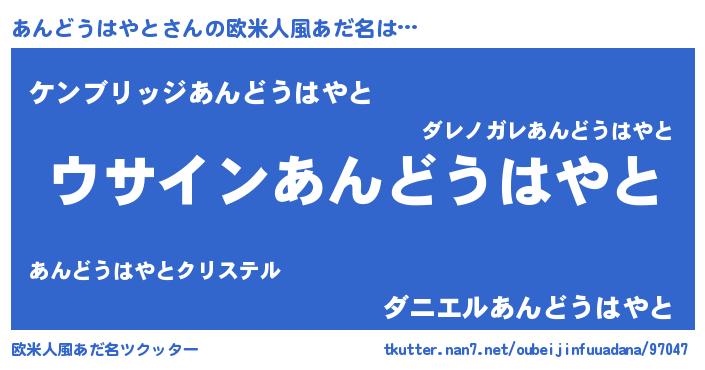 | 男性向けラノベタイトル風あだ名 | 『あんどうはやとの嫁は女の子じゃないと思った?』 |