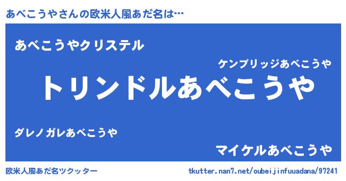 | 男性向けラノベタイトル風あだ名 | 『あべこうや~年齢イコール彼女いない歴の魔法使い~』 |