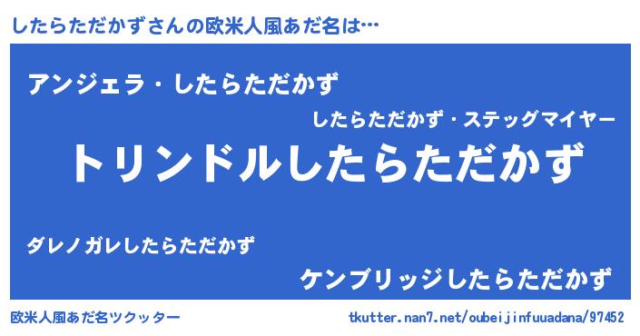 | 男性向けラノベタイトル風あだ名 | 『したらただかず~年齢イコール彼女いない歴の魔法使い~』 |
