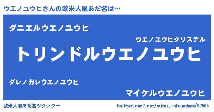 | 男性向けラノベタイトル風あだ名 | 『ウエノユウヒ~年齢イコール彼女いない歴の魔法使い~』 |