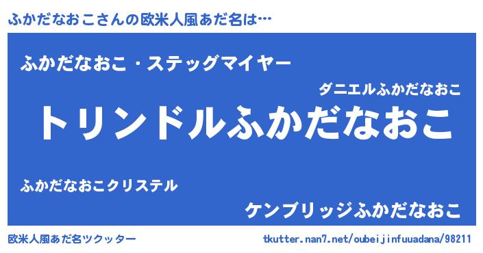 | 男性向けラノベタイトル風あだ名 | 『ふかだなおこ~年齢イコール彼女いない歴の魔法使い~』 |