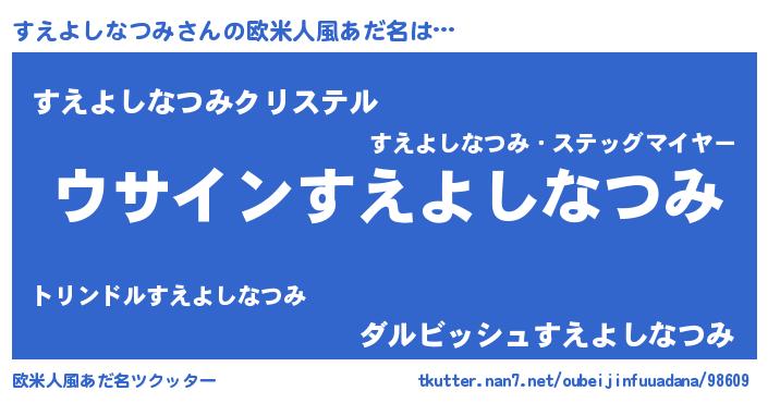| 男性向けラノベタイトル風あだ名 | 『すえよしなつみの嫁は女の子じゃないと思った?』 |