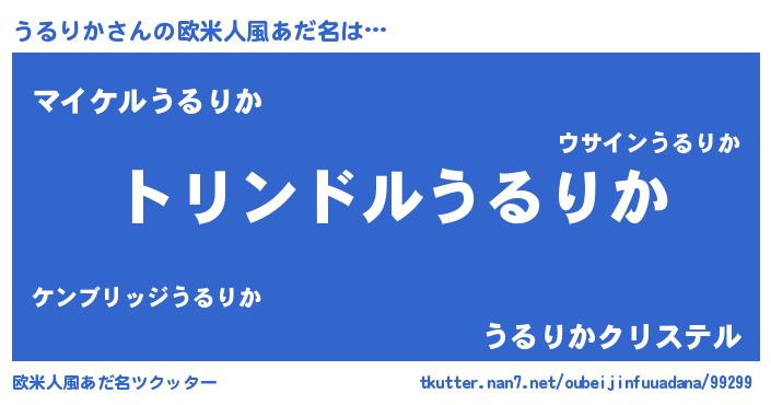 | 男性向けラノベタイトル風あだ名 | 『うるりか~年齢イコール彼女いない歴の魔法使い~』 |