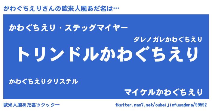 | 男性向けラノベタイトル風あだ名 | 『かわぐちえり~年齢イコール彼女いない歴の魔法使い~』 |
