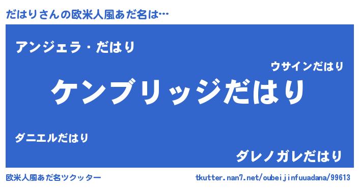 | 男性向けラノベタイトル風あだ名 | 『Re:だはりから始める異世界生活』 |