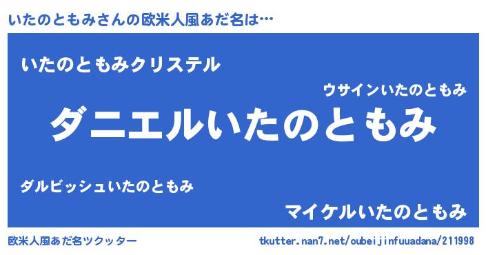 | 男性向けラノベタイトル風あだ名 | 『おまえをオタクにしてやるから、俺をいたのともみにしてくれ! 』 |