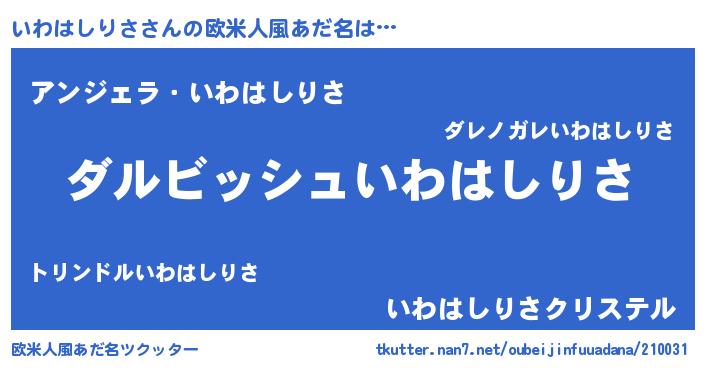 | 女子向けラノベタイトル風あだ名 | 『異世界で失敗しない100のいわはしりさ』 |