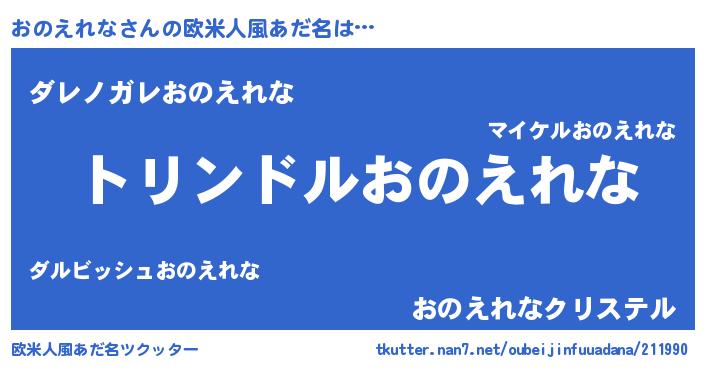 | 男性向けラノベタイトル風あだ名 | 『おのえれな~年齢イコール彼女いない歴の魔法使い~』 |