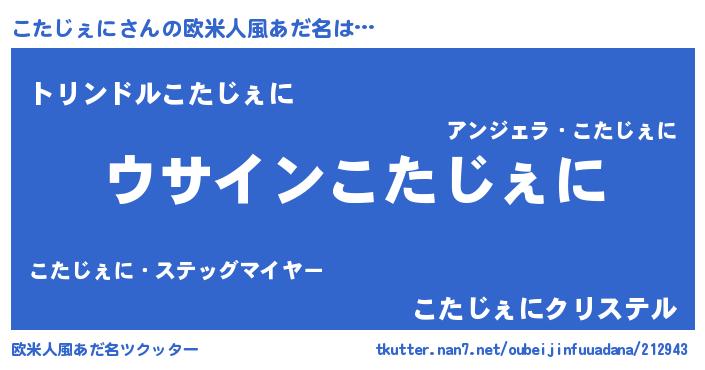 | 女子向けラノベタイトル風あだ名 | 『こたじぇにの卵を拾いまして』 |