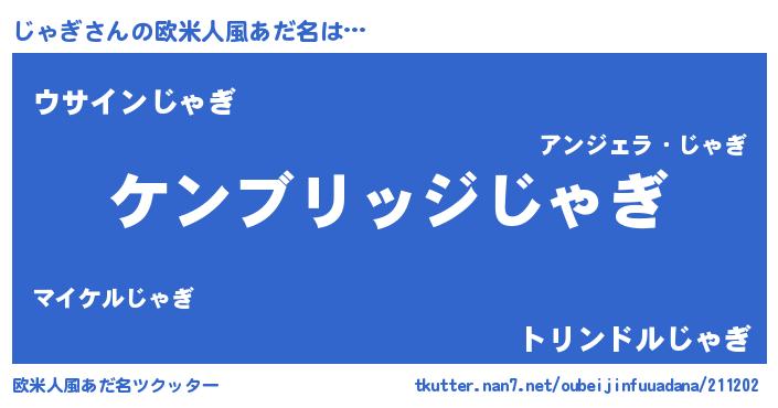 | 男性向けラノベタイトル風あだ名 | 『Re:じゃぎから始める異世界生活』 |