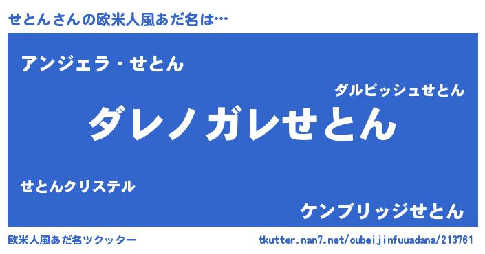 | 男性向けラノベタイトル風あだ名 | 『この素晴らしい世界にせとんを!』 |